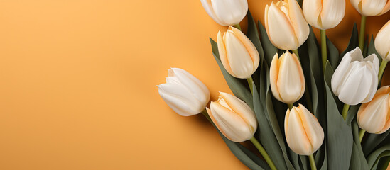 Yellow tulip bouquet, spring flowers on a pastel light yellow background with copy space. Mother’s day, Easter, Valentine’s Day, international women’s day, AI generative