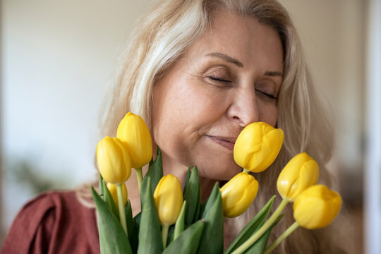Blond senior woman with eyes closed smelling fresh yellow tulip flowers at home