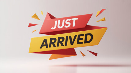 Red and yellow ribbon banner with JUSTARIVED text and bursts just arrived