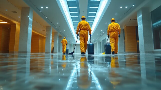 Caregiving team wearing yellow uniforms, emphasizing cleanliness and safety.
