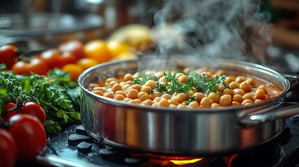 Steaming Pot of Chickpeas Cooking on a Stovetop with Fresh Parsley, Tomatoes and Bright Yellow Vegetables.