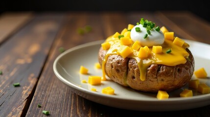 Savory Baked Potato Topped with Creamy Sauce and Diced Yellow Vegetables, Garnished with Fresh Herbs on a Rustic Wooden Table