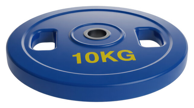 Blue 10kg weight plate with yellow text and silver ring isolated on a transparent background
