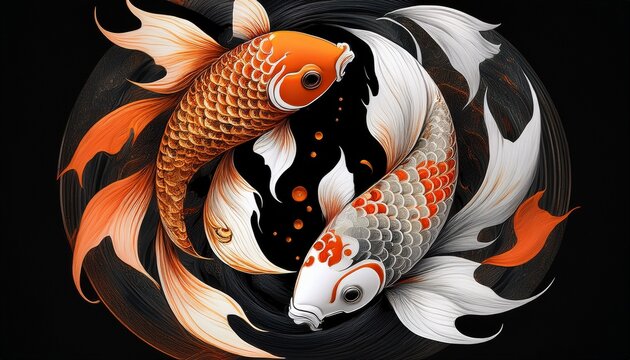 two koi fish swim in a circular motion one white and one orange forms a yin yang shape in the black background