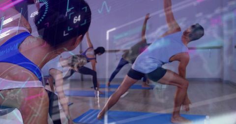 Group practicing yoga lunges in sunlit glass conservatory with augmented reality overlays