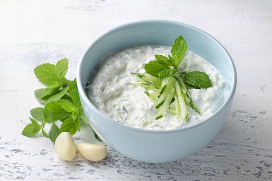 Fresh traditional Greek tzatziki sauce with yogurt, cucumber and mint light blue ceramic bowl on light background. Healthy Mediterranean appetizer, dip or dressing
