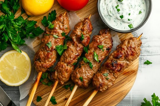 Delicious lamb kebabs with lemon and yogurt dip ultra hd photo