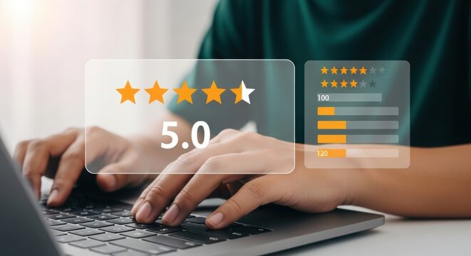Person typing on laptop with customer satisfaction overlay. Digital illustration of hands on keyboard with 5-star rating. Business professional using laptop with transparent review system.