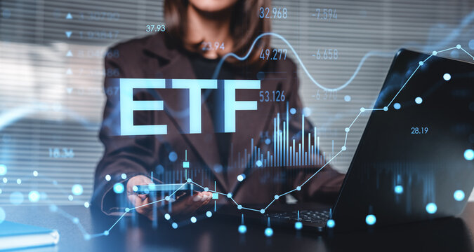 Businesswoman using laptop with ETF text and stock chart overlay