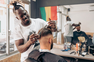 Young man with trendy haircut at barber shop. Barber does the hairstyle and beard trim.