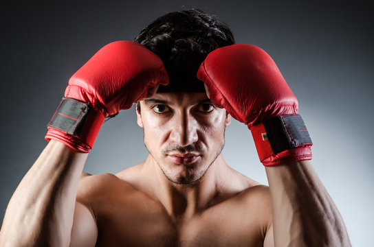 Tired boxer leaning against a punching bag wearing boxing gloves looking down