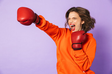Strong young woman boxer posing isolated over purple background wall wearing boxing gloves.