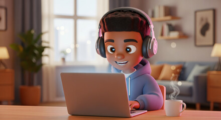 A highly detailed 3D digital illustration depicts a young character sitting at a wooden table using a laptop in a warmly lit, modern living room setting.