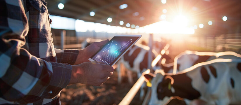 Dairy cows standing in barn stanchions with numbered ear tags and soft natural light