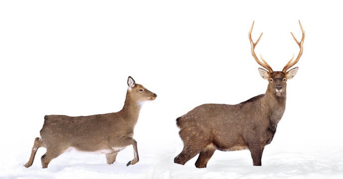 Playful winged deer standing on snowy slope gazing toward sunlight in magical alpine winter