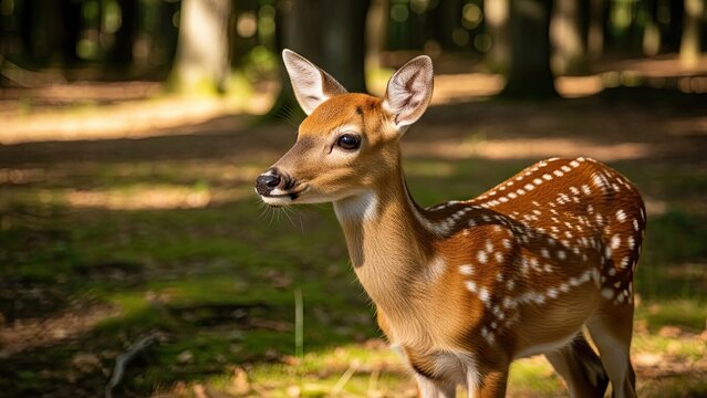 Majestic stag standing among sunlit oak trees in tranquil forest clearing