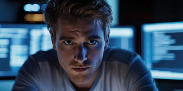 Thinking IT manager working on a desktop computer and laptop in a modern office. Information Technology software engineer analyzing data management system. Thoughtful analyst looking for a solution