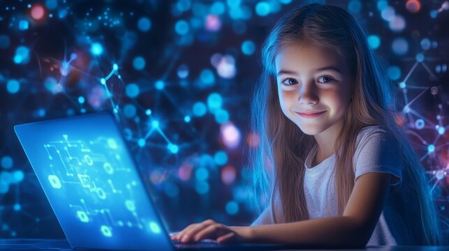 Young girl learning on laptop with data overlays in classroom