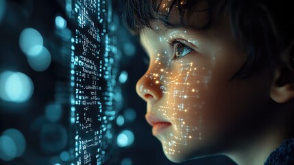 Little child with digital code data overlay, cyberspace and information technology of the future. Ai education and cybersecurity