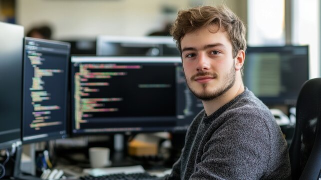 A young male software engineer is seated at his desk in an office environment, engaging with code on multiple computer screens, illustrating a modern tech workspace.