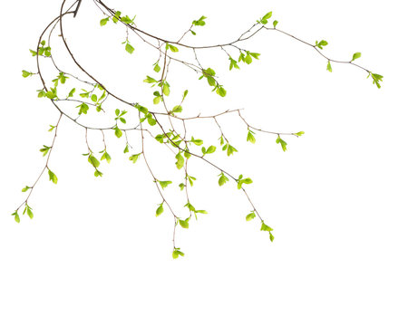 Birch twigs with the young green leaves hang down isolated on white. Natural birch background located on top of the picture.