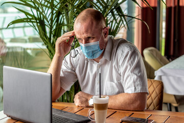 Shot of a concerned man with face mask, working on laptop while sitting at his working place.Contemplating businessman in the restaurant feeling worried.Young man is fully concentrated on on his work.