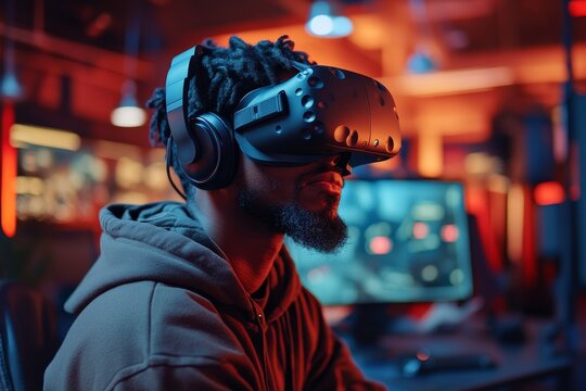 Young man immersed in a digital experience. Wearing VR glasses and headphones, exploring virtual realities against a dynamic digital backdrop.