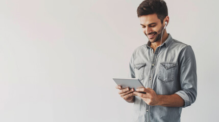 cheerful young man is looking at a tablet he is holding with an amused expression, wearing a grey shirt against a soft white background