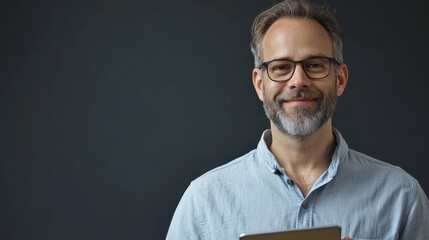 A smiling man in a white shirt looking at a tablet against a gray studio background