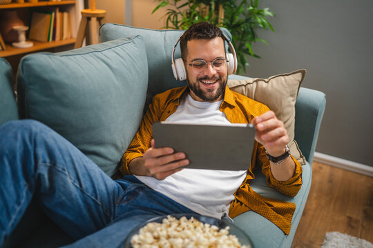 A handsome young hispanic man enjoys a tablet in his cozy living room, seated comfortably on a modern sofa, highlighting the relaxed indoor ambiance of his stylish home.