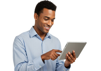 Smiling man interacting with digital tablet device in a professional setting transparent background