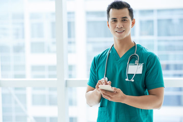 Attractive Asian man in medical uniform smiling and looking at camera while standing near hospital window and using smartphone
