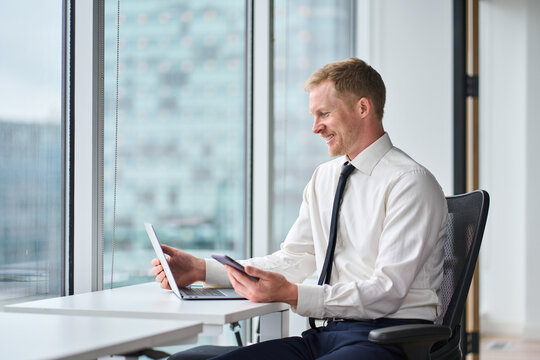 Friendly and smiling businessman in office recording audio message, man using smartphone app for communication, investor in business suit near window inside building.