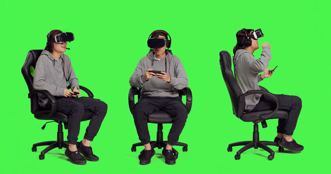 Asian person playing mobile games over full body greenscreen, holding smartphone to play online rpg contest. Modern gamer using phone gadget to have fun with new gameplay on chair.