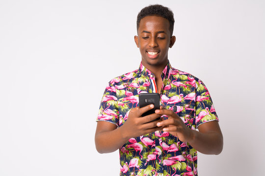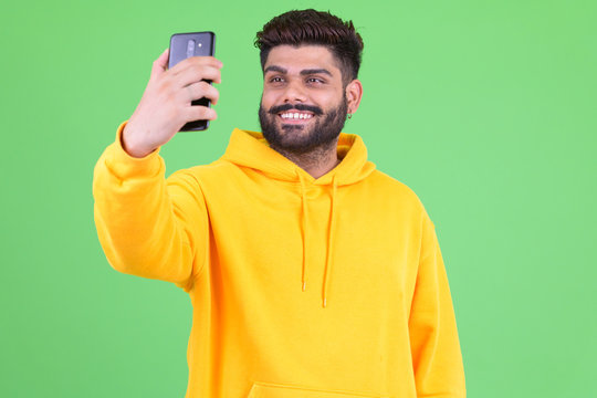 Young Man Smiling While Using Smartphone Greenscreen Background Images