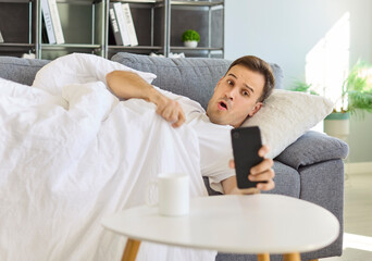Sleepy man checks alarm on phone on sofa. Under a blanket, he checks the alarm and reacts in surprise, still in bed, realizing its morning and he may be late. Late wakeu, stress and oversleeping.