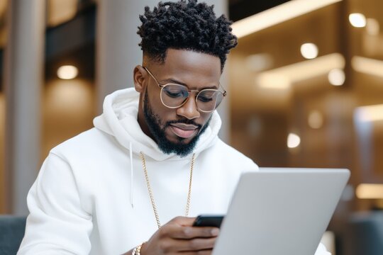 Young man engaged with smartphone and tablet reflecting digital lifestyle
