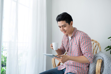 Smiling young man using a digital tablet while sitting at a wooden table with a hot coffee mug in a sunlit living room at home.