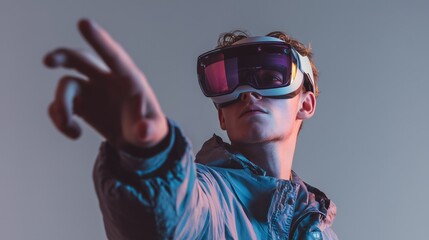 Young man using virtual reality headset with futuristic gesture, immersive VR experience and digital interaction technology concept in modern gaming and metaverse environment
