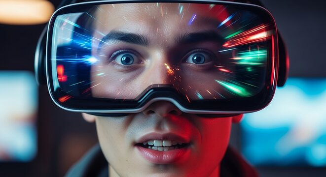 Enthusiastic young man wearing VR headset with colorful light trails reflecting, concept for immersive gaming experience, interactive simulations and futuristic entertainment platform