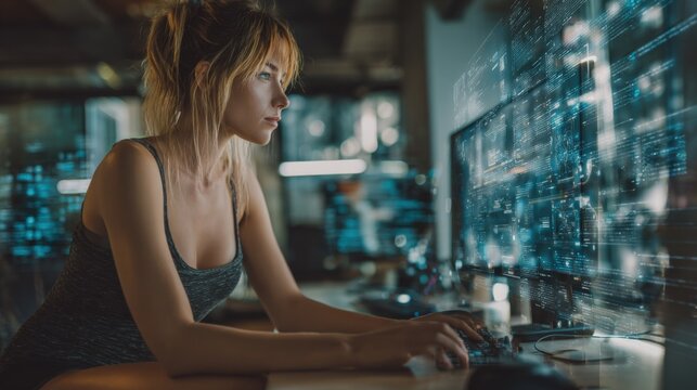 Focused Young Woman Studying Complex Data Streams on a Large Digital Display