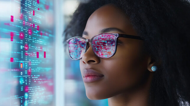 Data Analyst: A focused young woman, wearing glasses, examines a complex data stream projected on a large screen. The reflection in her glasses shows the intricate data.