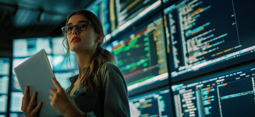 Young woman in glasses holding a tablet, standing in front of multiple data screens in a dimly lit control room
