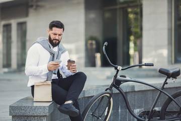 Young man sipping coffee and checking smartphone while sitting on ledge in urban plaza