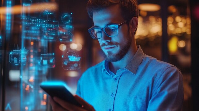 Focused professional in glasses illuminated by blue light from smartphone, surrounded by futuristic holographic displays in dimly lit environment.