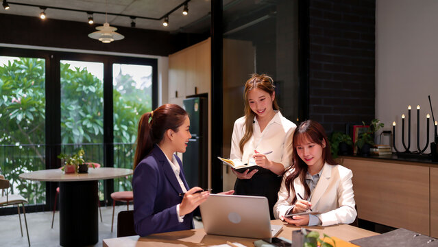 Asian Businesswomen Meeting in Modern Office Collaborative Project Discussion Teamwork Professional Women Smiling Using Laptop and Tablet Technology Coworking Space