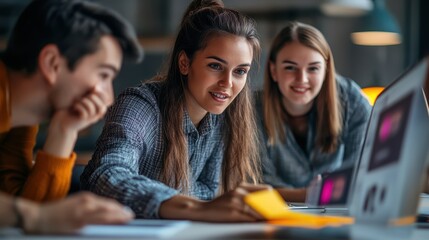 A group of young professionals working together in a modern office, collaborating on a creative project with focused expressions and teamwork.