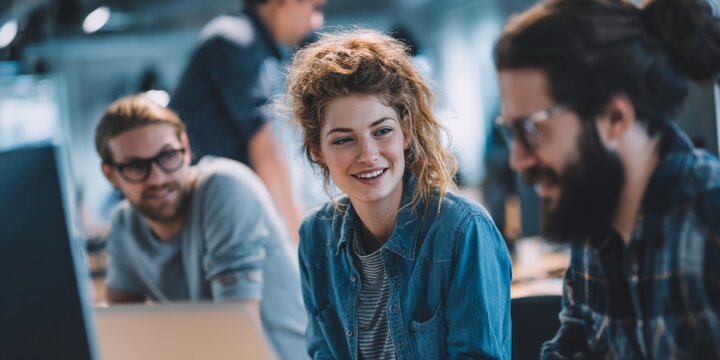 Young professionals collaborating in a modern workspace with technology and creativity for teamwork and innovation.