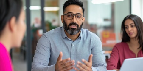 Diverse young professionals collaborating and discussing ideas in a modern office environment