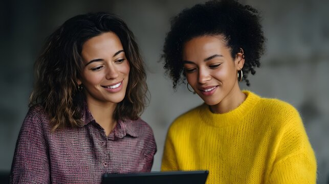 Man and woman look at tablet together, smiling. Colleagues in modern office collaborate on project using digital device. People discuss ideas at work, teamwork.